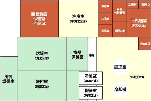回収容器は連続自動食器洗浄器で、選別、洗浄、乾燥を衛生的に行い、清潔区域である食器保管室に運ばれ消毒されます。